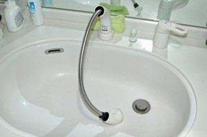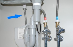 洗面台の下を開けると、ここ(青い矢印んとこ)にフレキシブルホース。普通にシャワーを使ってもホースの外側を伝って水が落ちてくるそうなので、ホースを下から覆うように水受けが設置されてます。