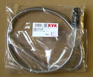 まず入居時に貰った「シングルレバー式洗髪シャワー」の取扱説明書を見てメーカー (KVK) とシャワー本体の型番 (KF568C) を確認。分解図はこちら(PDF)。Web検索すると交換パーツの型番 (Z411714) が判ったので、もう一度検索したらWeb通販でホースが買えることが判りました。念のためにメーカーさんへ問い合わせたら、写真入りの交換作業説明書を親切に送って下さったので、安心して発注・交換作業できました。